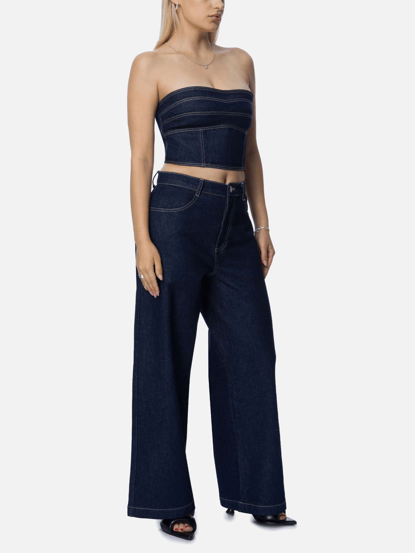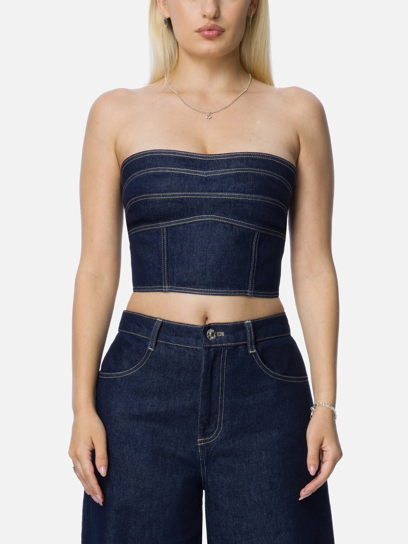 Coupled Straplez denim corset.
