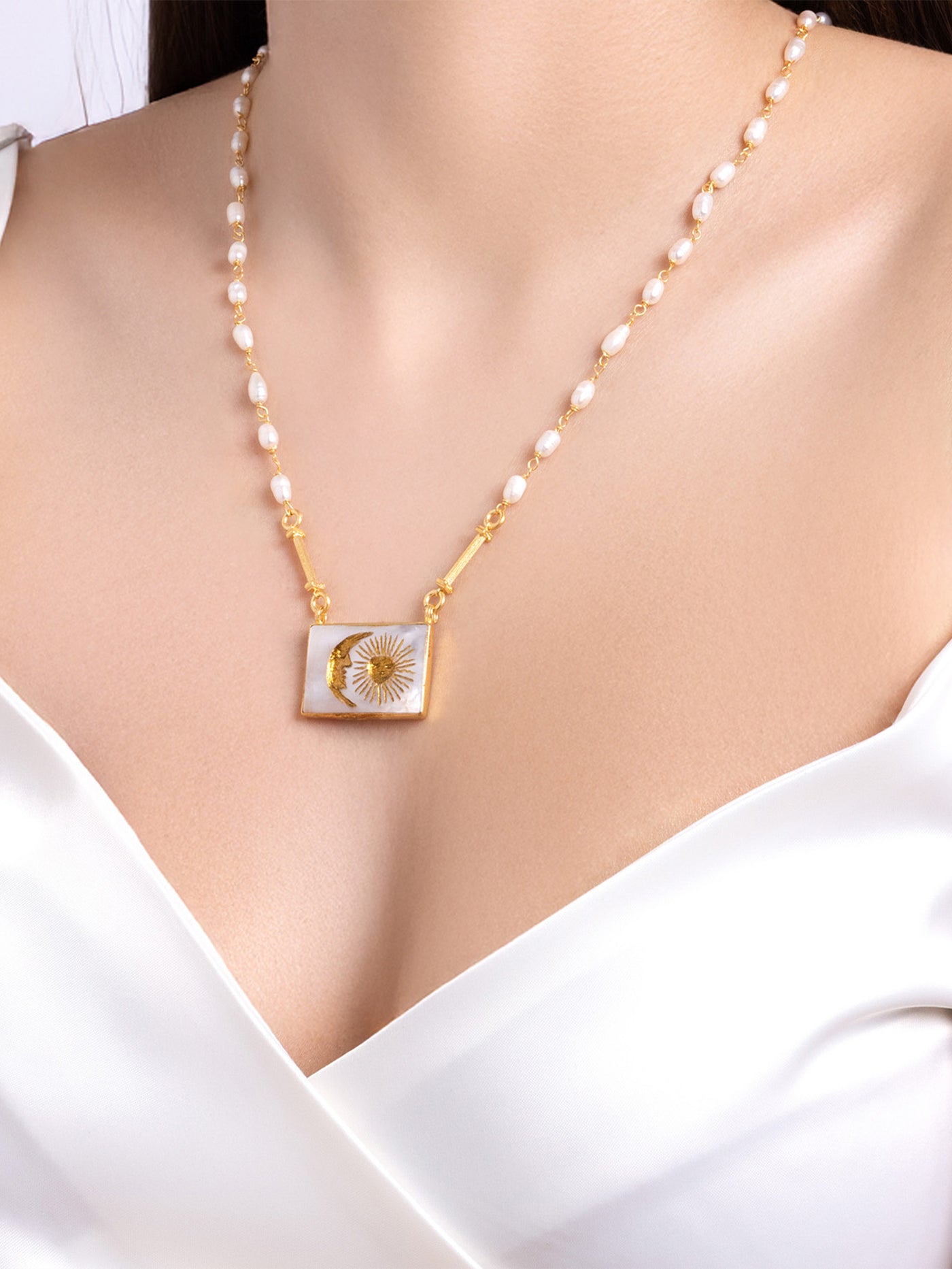 Helios and Selene necklace, Helios, who danced their love in the sky,L heatL The Sun God, and Selene, have a design that inspires the story of the impressive Moon goddess. Inspired by this timeless fairy tale, consisting of 22 carat gold coating over 925 sterling silver, contains a magnificent Mother-of-Pearl (seashell) PENDANTI, which captures the infinite harmony between our necklace, light and darkness. The chain is adorned with ionic Greek columns and sea pearls that evoke ancient glory.