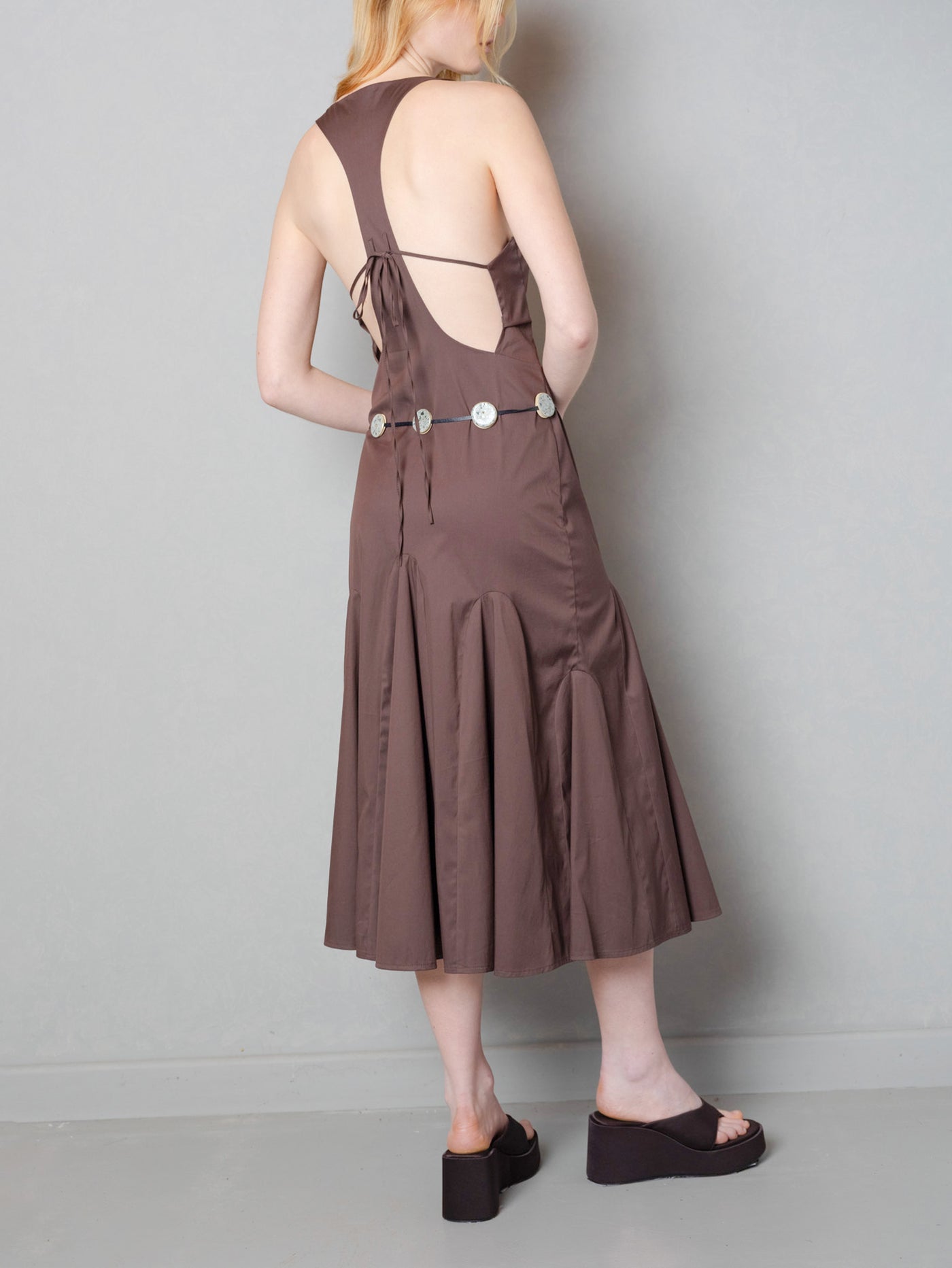 Zarif bir sadelikle tasarlanan bu kahverengi midi elbise, ince detaylarıyla öne çıkıyor. Derin V yakası ve bele oturan formu feminen bir siluet yaratırken, etek ucundaki godeleri dinamizm katıyor. Açık sırt detayı, ayarlanabilir ince bağlarla hem zarafet hem de rahatlık sağlıyor. Özel günlerden gündelik akşamlarına kadar farklı ortamlara uyum sağlayan zamansız bir parça.