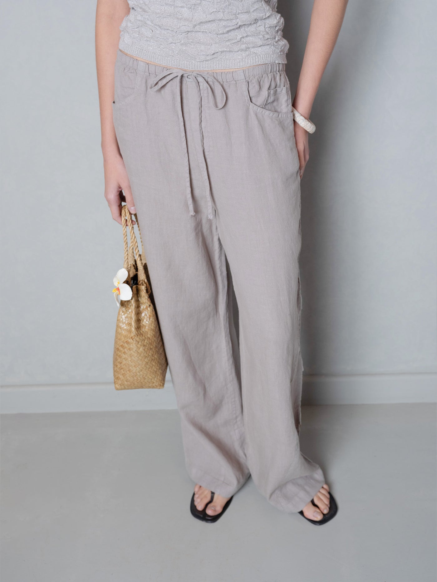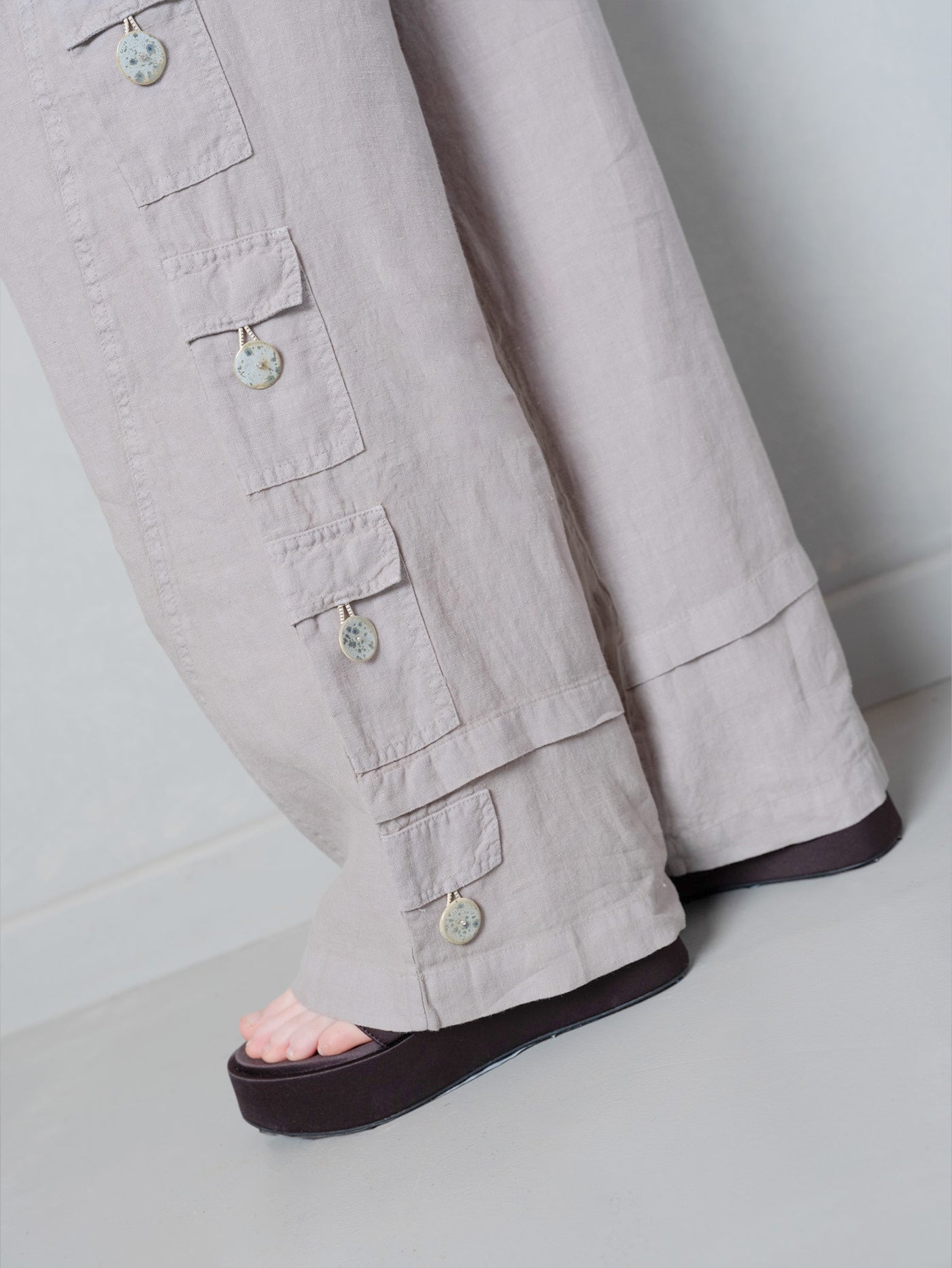 Rahat kesimi ve doğal dokusuyla öne çıkan bu kargo pantolon, gündelik konforu sofistike bir çizgiyle buluşturuyor. Bel kısmındaki lastik ve bağcık detayı pratiklik sağlıyor, geniş paça formu akıcı bir siluet yaratıyor. Arka ve yan ceplerdeki seramik düğmeler el işçiliğinin izlerini taşıyor ve tasarıma karakter katıyor. Günlük şehir kombinlerinde rahat bir şıklık sunuyor, tatil gardırobunda ise çok yönlü bir parça olarak yerini koruyor.