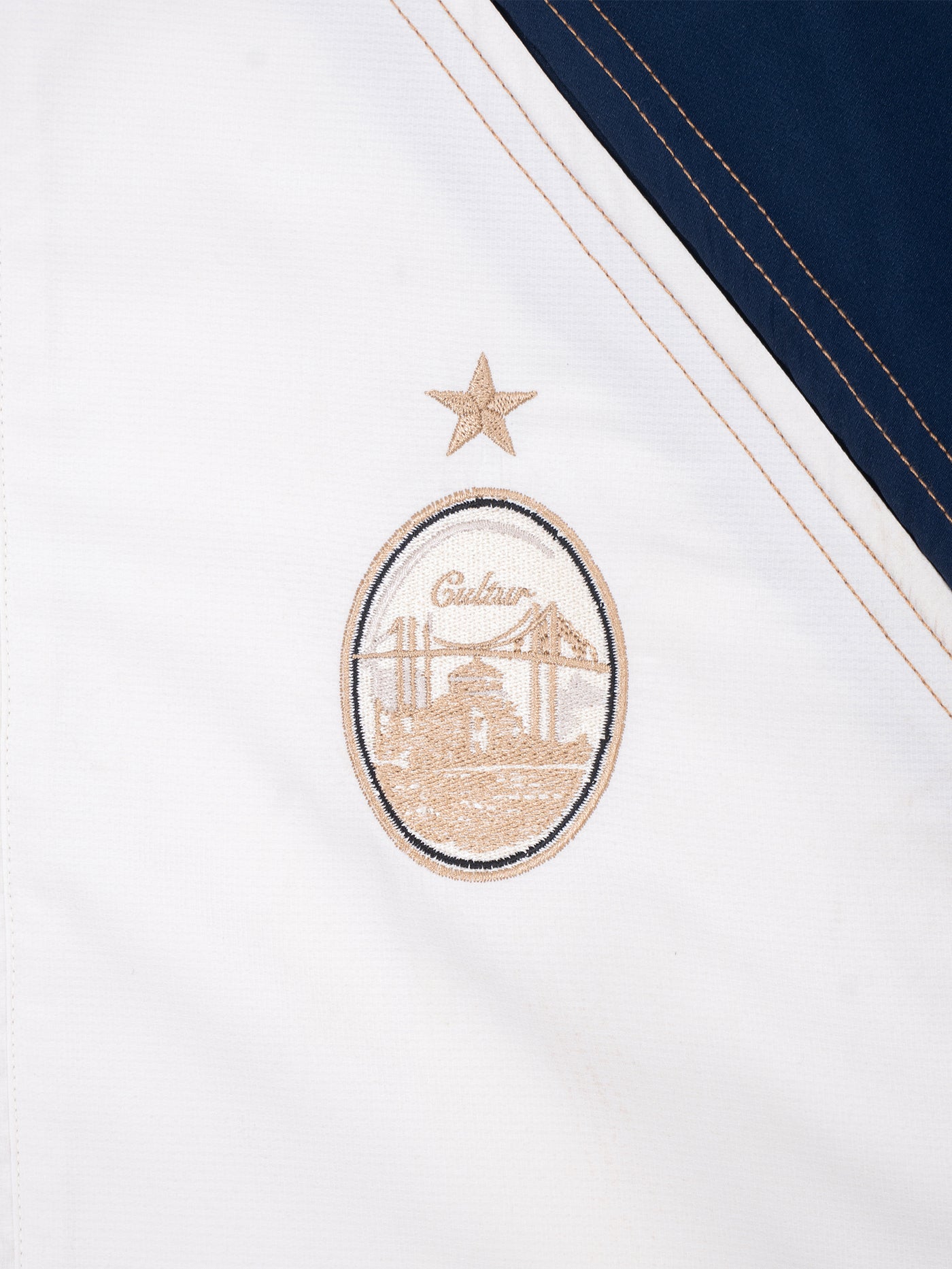Lacivert ve kırık beyaz renklerde, altın rengi kontrast dikişli, bol kesim eşofman ceketimiz. Retro futbol parçalarından ve İstanbul şehrinden ilham aldık. %85 polyester ve %15 elastan kumaştan üretilmiştir.