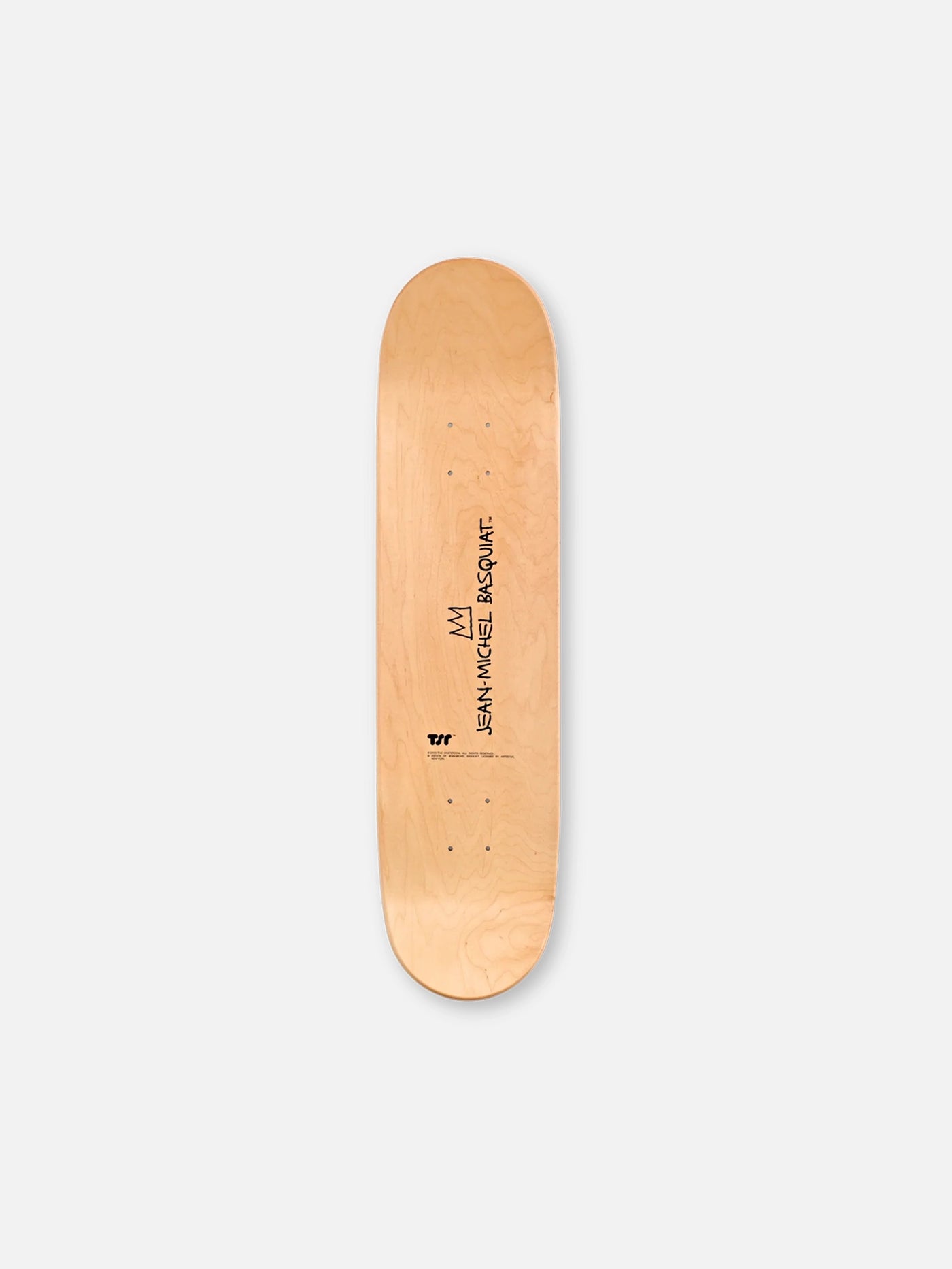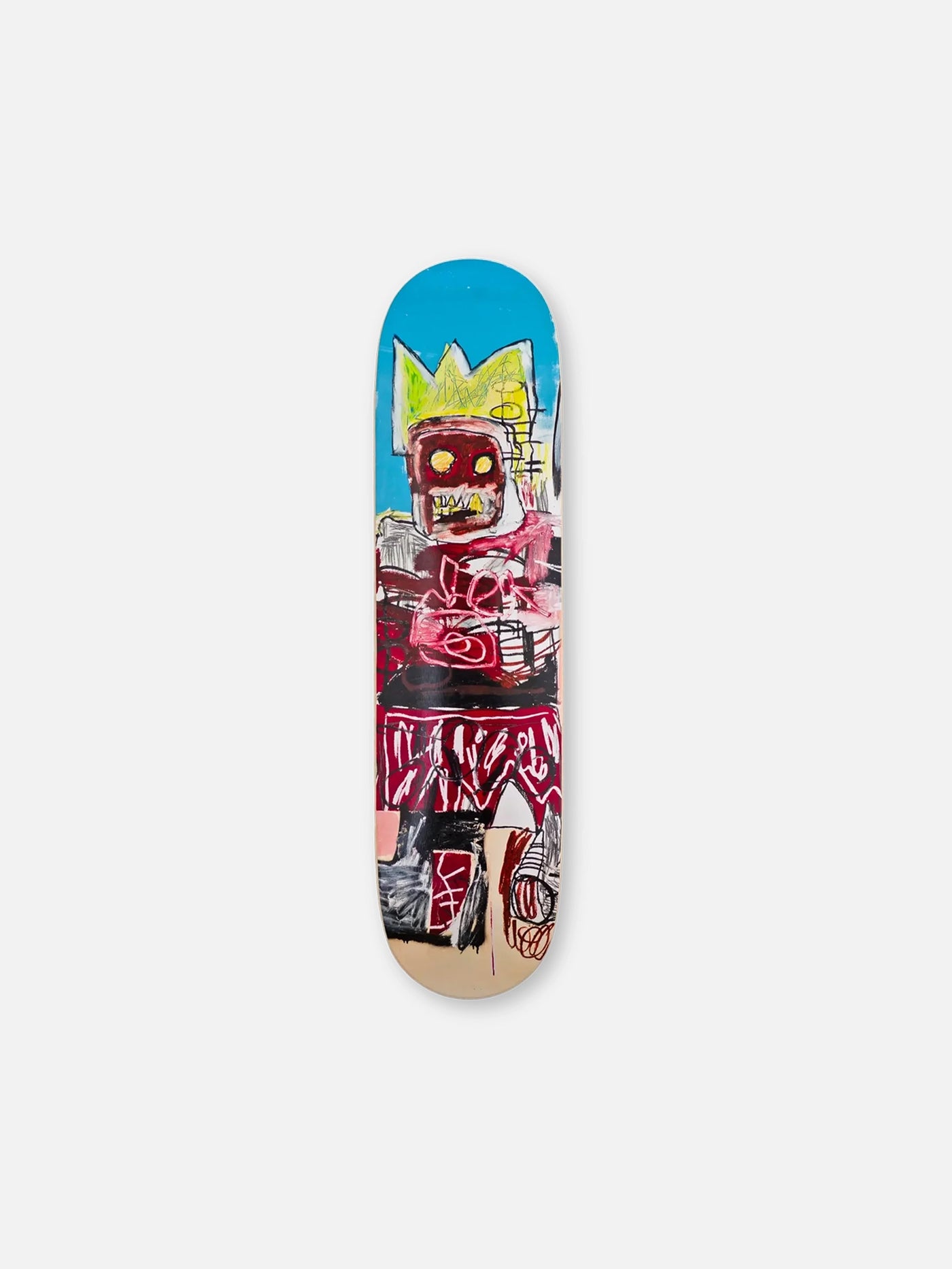 Basquiat’ın 1982 yapımı “Untitled (Red King)” eseri, kırmızı ve siyah vurgularla dolu ifade dolu çizgileriyle güçlü bir duruş sergiliyor. Ahşap zemin üzerindeki ham işaretler, taç sembolü ve karakteristik graffiti stilini bir araya getiriyor. Tek deck olarak sunulan bu özel baskı, sanatın sokak enerjisini günlük yaşama taşıyor – ister duvarda bir konuşmacı, ister kaykay ile sokağın sesi olabilir. Zamanın ötesinde bir ikonun tutkulu izlerini taşıyor.
