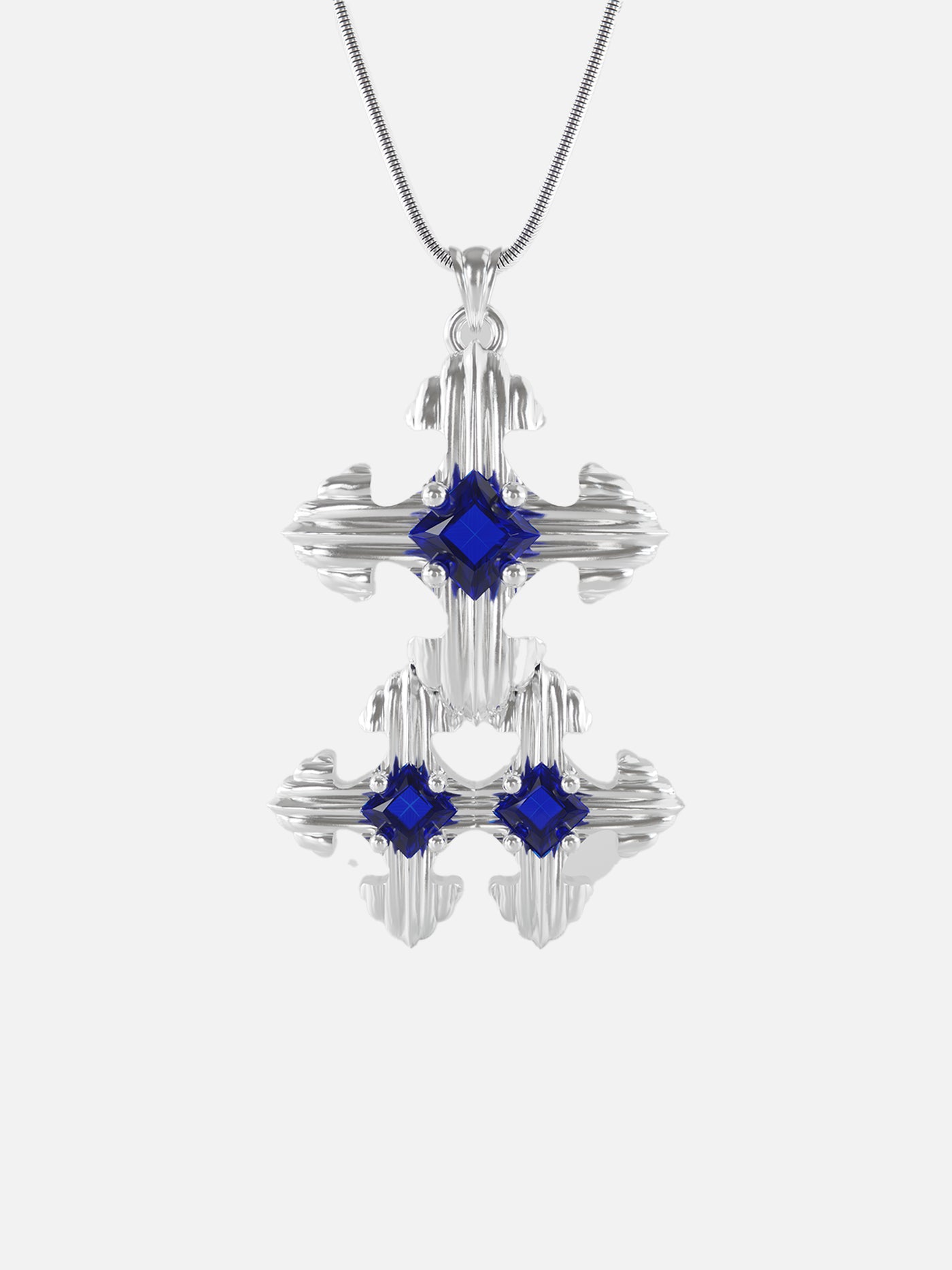 Tamamen altınla kaplanmış, merkezinde 925 ayar gümüş, üzerinde ise mavi taş imzası. Formu tamamlayan altın kaplama zincire asılı. Kusursuz bir dengeyle.