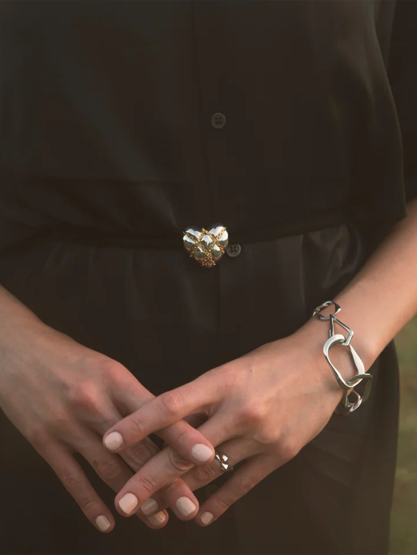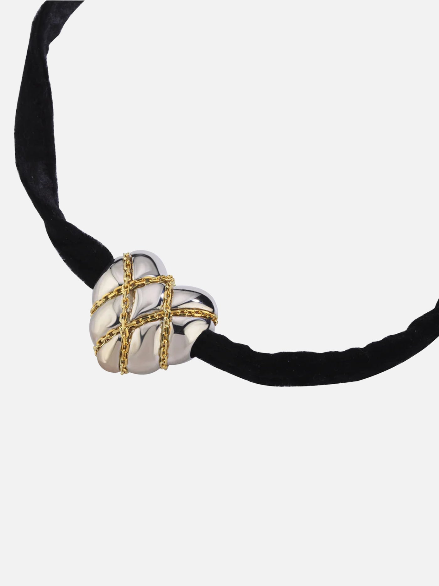 Altın kaplamalı zincirlerle sarılmış heykelsi gümüş kalp, tutkuyu, bağı ve gücü simgeliyor